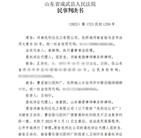 山东省成武县人民法院于近日就河南先利达化工有限公司起诉王某某和曹县某肥料厂侵害商标权及不正当竞争一案做出一审判决(案号:(2025)鲁1723民初1259号),认定二被告侵犯先利达公司“红霸”系列注册商标专用权,判令其立即停止侵权行为并赔偿经济损失及合理开支共计35600元。