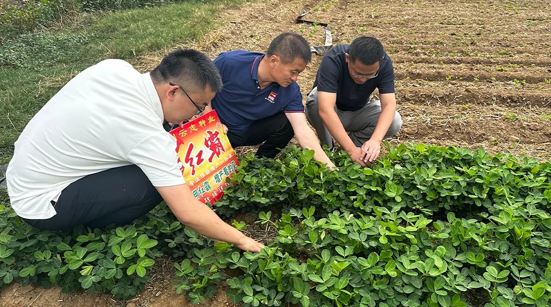 专家老师查看花生情况 红霸科技陈总与植保专家鲁老师深入邓州“红霸”花生田,手把手为农户传技术、解难题。